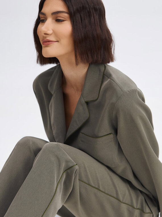 Το ατσαλάκωτο ύφασμα είναι αυτό που κάνει το συγκεκριμένο σετ να ξεχωρίζει. Η χαλαρή εφαρμογή του και η λεπτομέρεια με το ρέλι το χαρακτηρίζουν διαχρονικό. Διαθέτει πουκάμισο με ντυμένα κουμπιά σε άνετη γραμμή και μικρή τσέπη στο αριστερό του μέρος. Το παντελόνι διαθέτει λάστιχο στην μέση και είναι σε άνετη γραμμή με στενό τελείωμα μέχρι τον αστράγαλο.